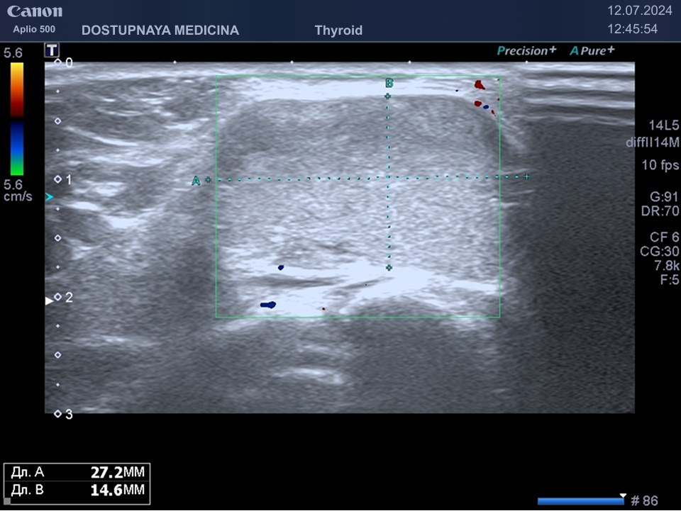 При ультразвуковом исследовании важно разобраться имеем мы дело с лимфаденопатией по воспалительному типу или с лимфаденопатией по пролиферативному типу. При лимфаденопатии по воспалительному типу сохраняется дифференцировка лимфоузла на слои, но корковый слой лимфатического узла утолщен, кровоток в лимфоузле хиларный (центральный), чаще всего отмечается усиление хиларного кровотока в режиме ЦДК, узел имеет овоидную форму и его горизонтальный размер всегда больше вертикального.