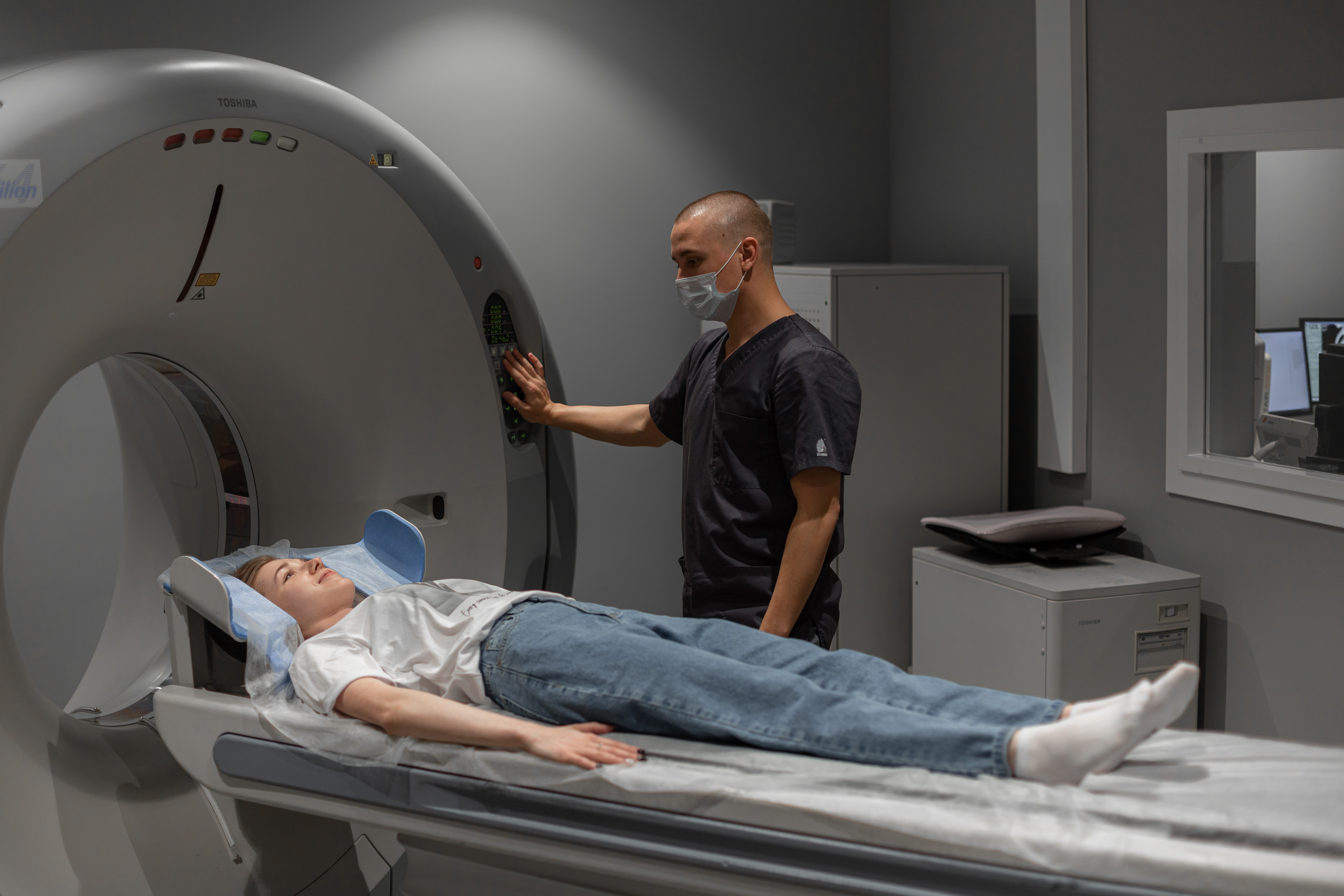 Исследование проводится лежа в горизонтальном положении на выдвижном столе томографа. Пациента просят не двигаться во время исследования, так как движения могут снизить четкость изображений.