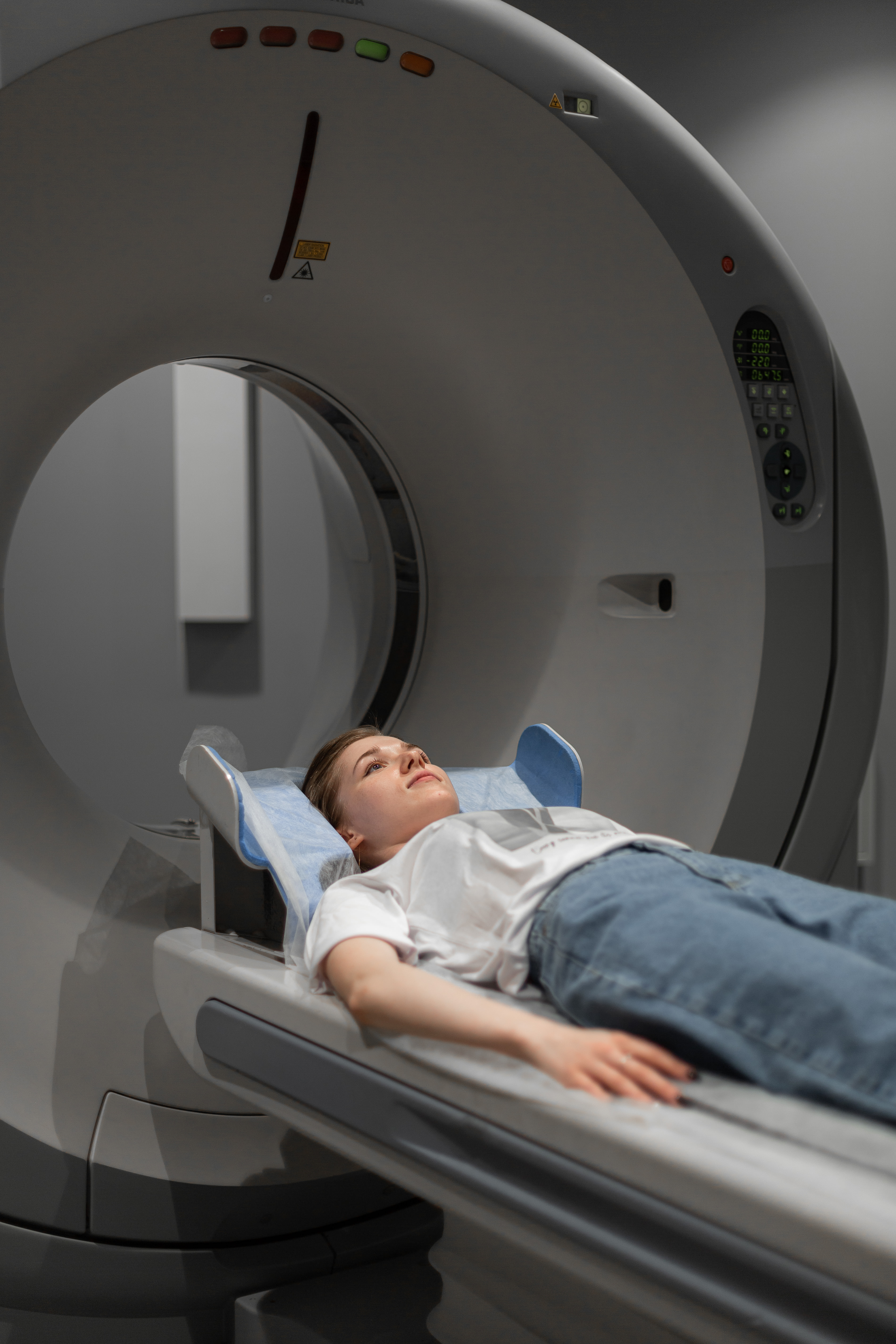 Пациент во время процедуры исследования располагается лежа на специальном столе, который двигается в раме томографа. По сравнению с МРТ отверстие томографа широкое, вокруг пространство полностью открытое и свободное.