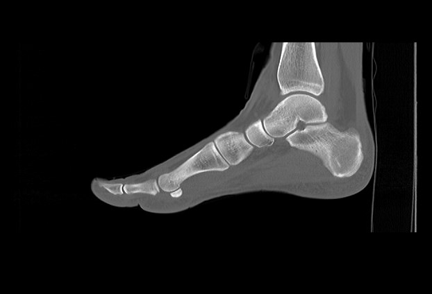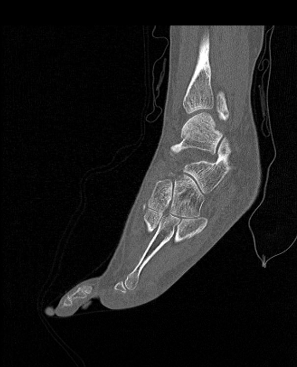 С помощью мультиспиральной КТ проводится точная диагностика травм стопы, позволяющая оценить расположение костных отломков. Метод КТ применяется для визуализации костей стопы при планировании хирургического вмешательства, затем в послеоперационном периоде для оценки правильности репозиции костных отломков и для контроля процессов регенерации кости.