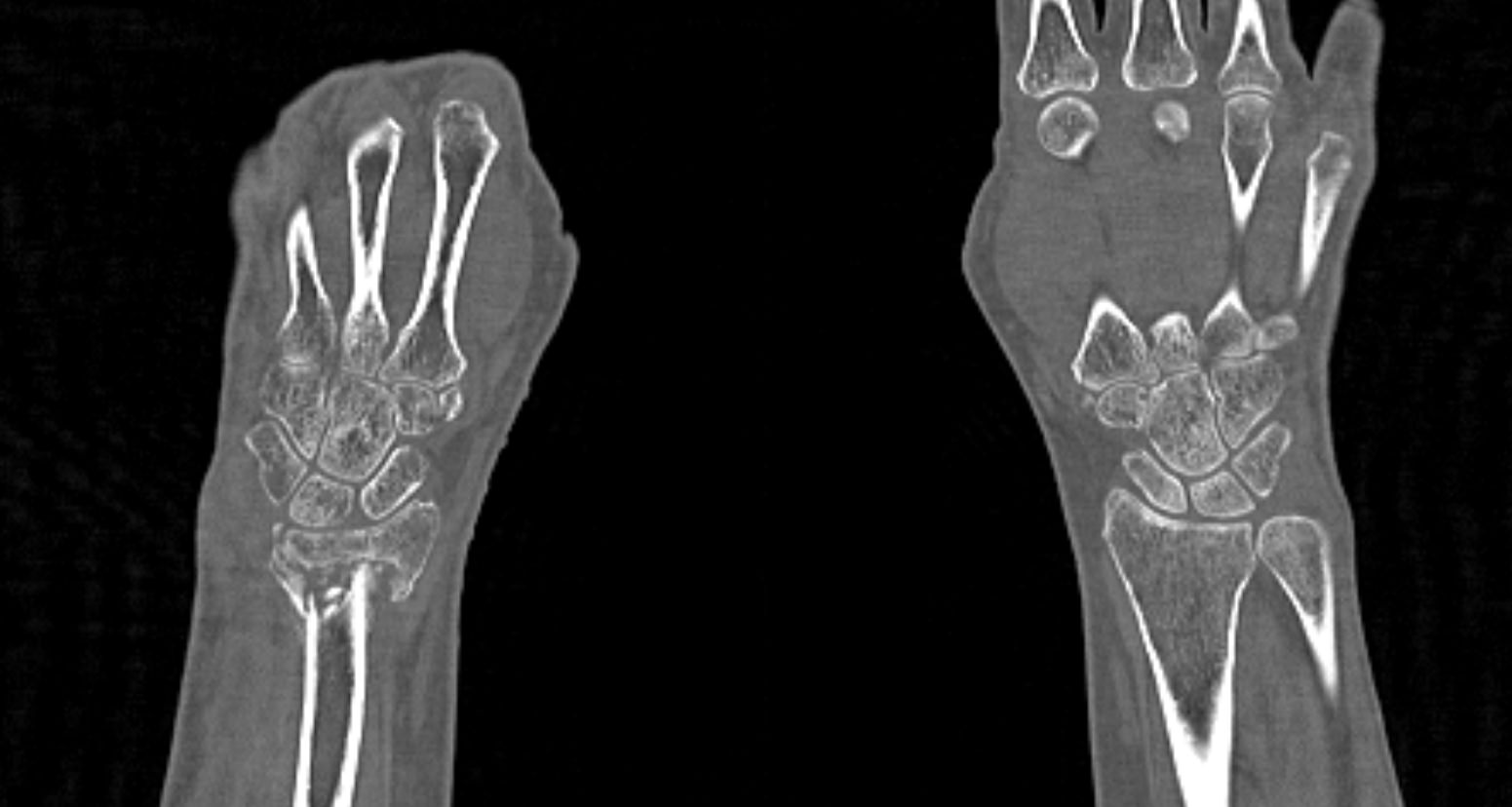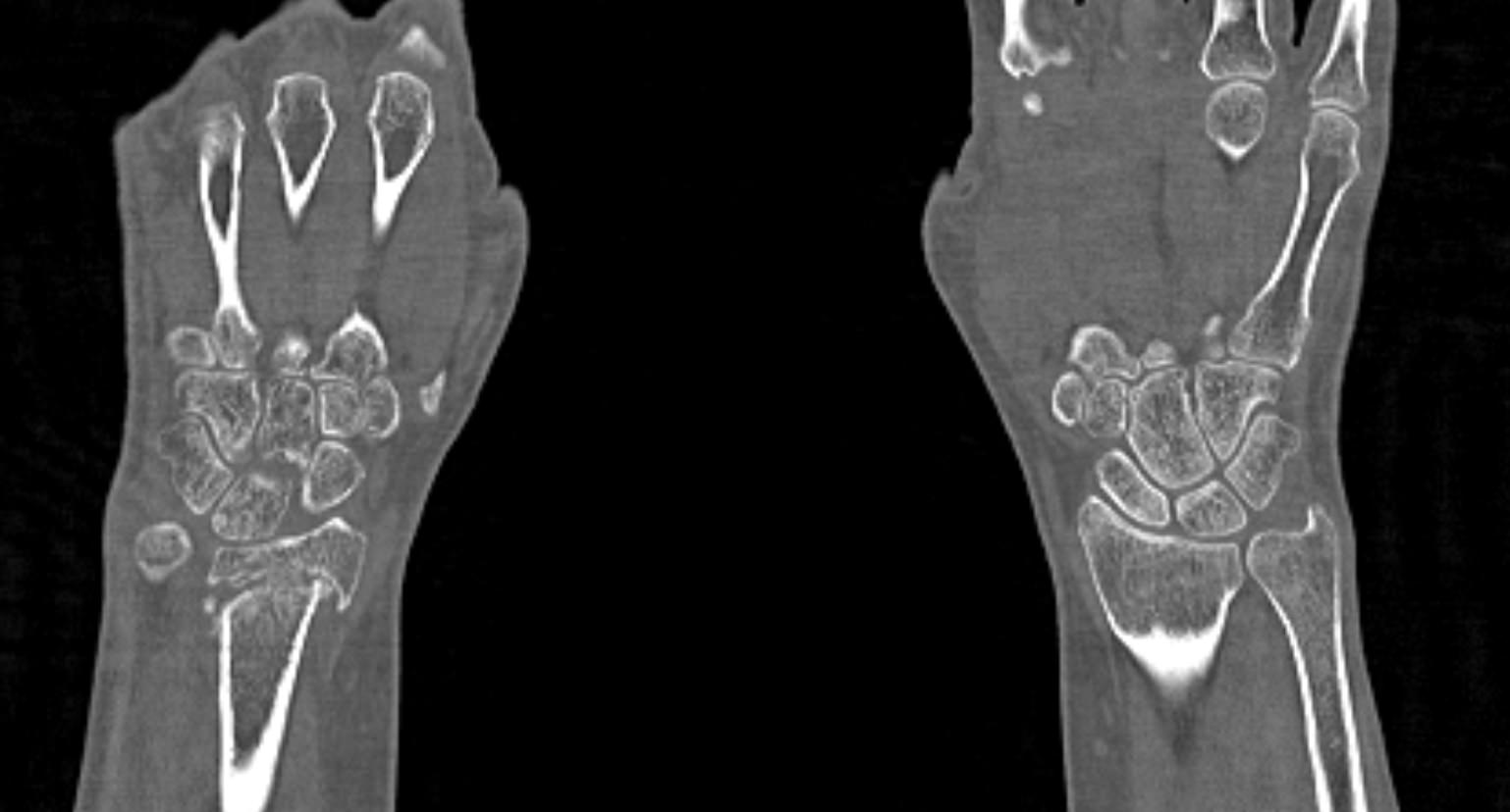 Таким образом мультиспиральная компьютерная томография позволяет оценить состояние всех структур лучезапястного сустава, выявить травматические повреждения, признаки воспалительных заболеваний, диагностировать аномалии развития и опухолевые образования. При травмах на снимках и трехмерных изображениях хорошо видны фрагменты костных отломков, эти данные используются при подготовке к оперативным вмешательствам. После операции результаты КТ позволяют оценить правильность репозиции костных структур, выявить послеоперационные осложнения, отследить в динамике процесс восстановления тканей.