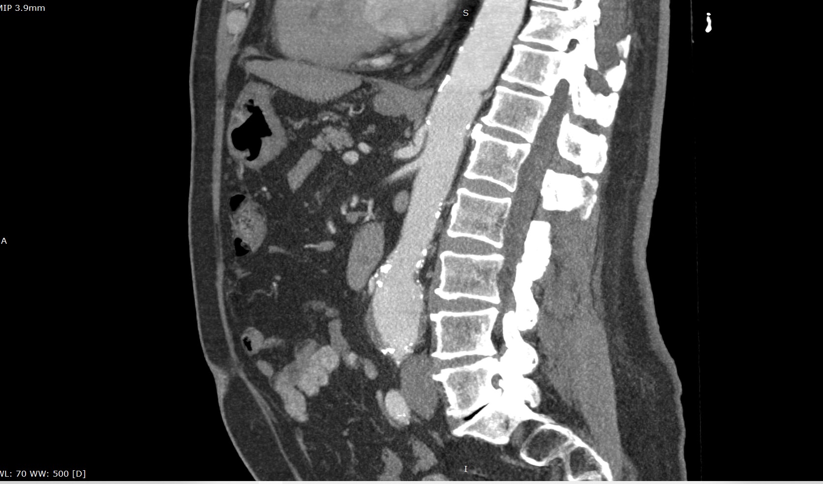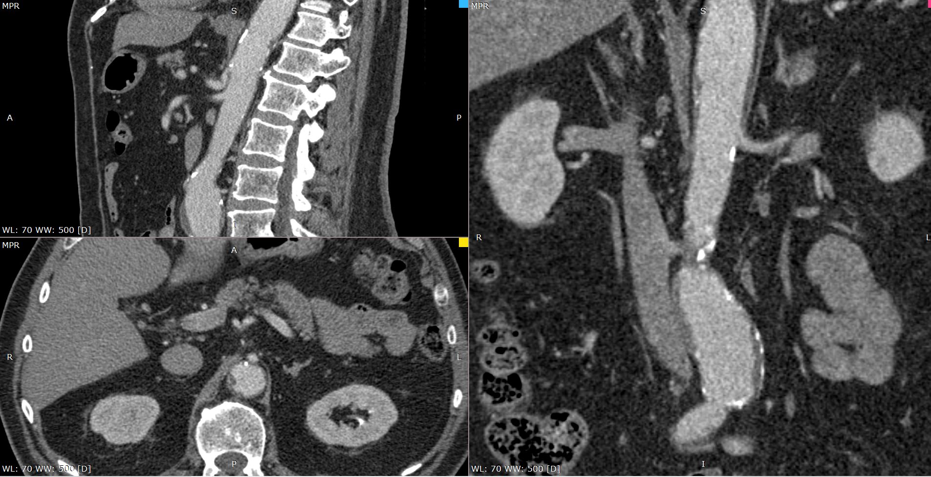 На снимках мультиспиральной компьютерной томографии с контрастированием хорошо визуализируется брюшная часть аорты, чревный ствол, брыжеечные артерии. При этом можно выявить признаки поражения висцеральных ветвей аорты, то есть сужение просвета сосудов за счет: