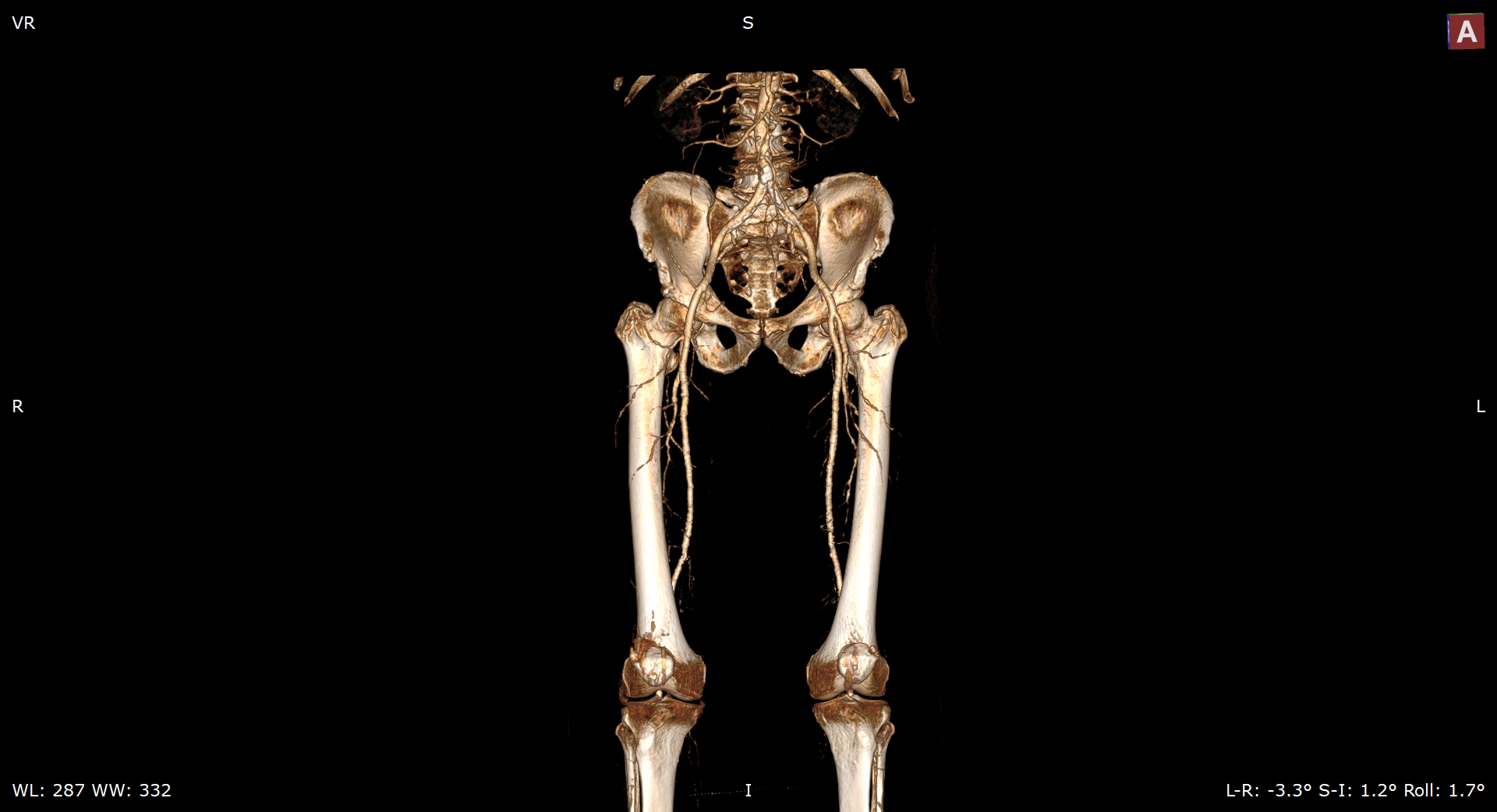 - КТ сосудов от бифуркации аорты до коленного сустава (оценивается нижняя часть брюшной аорты, разветвление аорты, подвздошные артерии, бедренные и подколенные артерии)