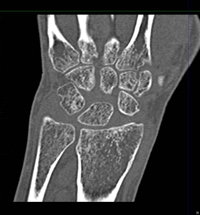 Таким образом, мультиспиральная компьютерная томография позволяет оценить состояние всех структур лучезапястного сустава, выявить травматические повреждения, признаки воспалительных заболеваний, диагностировать аномалии развития и опухолевые образования. При травмах на снимках и трехмерных изображениях хорошо видны фрагменты костных отломков, эти данные используются при подготовке к оперативным вмешательствам. После операции результаты КТ позволяют оценить правильность репозиции костных структур, выявить послеоперационные осложнения, отследить в динамике процесс восстановления тканей.