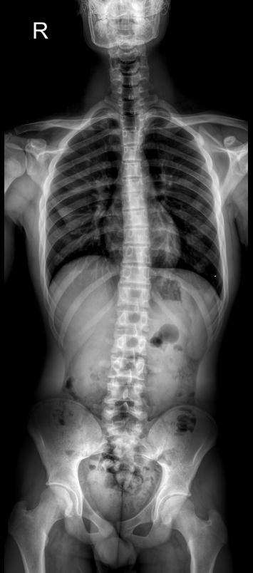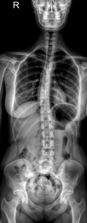 При появлении признаков кифосколиоза или подозрении на него врач в качестве первичного обследования обычно назначает рентген. При этом рекомендован снимок всего позвоночного столба: как для выявления различных аномалий развития позвонков, так и для определения углов отклонения и, соответственно, степени заболевания. Для этого делают несколько обычных прицельных снимков и соединяют их в один с помощью компьютера. Несмотря на большую, казалось бы, дозу облучения, волноваться не стоит. Современное цифровое рентгеновское оборудование излучает настолько маленькую дозу, что даже при серии снимков трудно набрать допустимое для человеческого организма количество облучения.