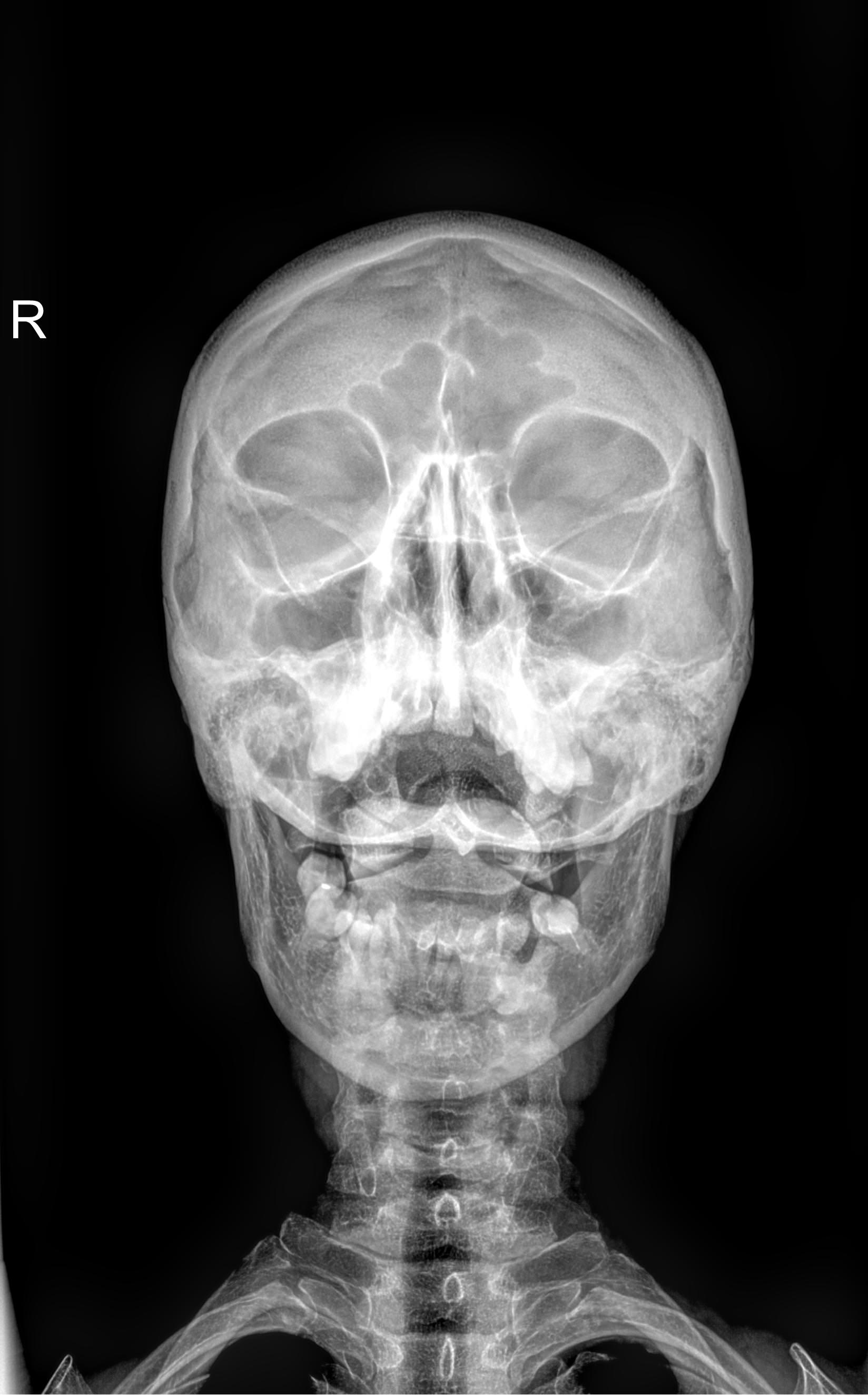 - «Через открытый рот» ― то же положение, только необходимо как можно ниже опустить нижнюю челюсть, не запрокидывая сильно голову. Аппарат при этом не касается тела. В этом положении отчетливо видны 2 верхних позвонка и их сочленение, нижняя челюсть их не закрывает;