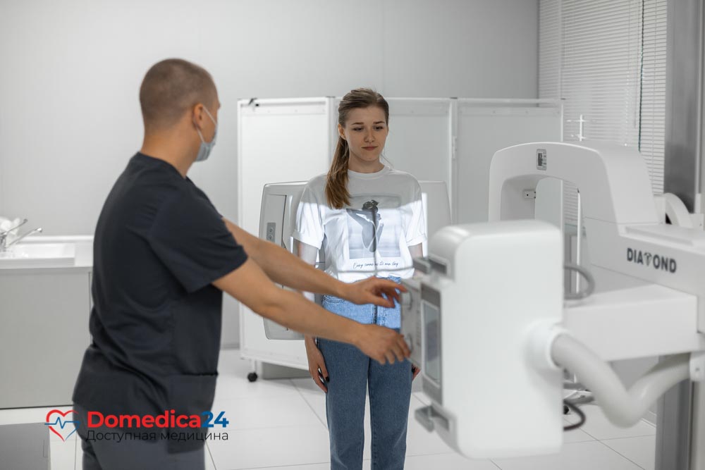 Пациент раздевается до пояса, оставляет металлические предметы и гаджеты на кушетке.Медсестра помогает надеть защитный фартук на область паха и встать прямо перед экраном, к которому необходимо прижаться животом. По команде врача надо задержать дыхание. При этом какие-либо ощущения, кроме прикосновения кожи к экрану, отсутствуют. Съемка длится около 5 секунд, затем доктор скажет, что можно дышать и одеваться.
