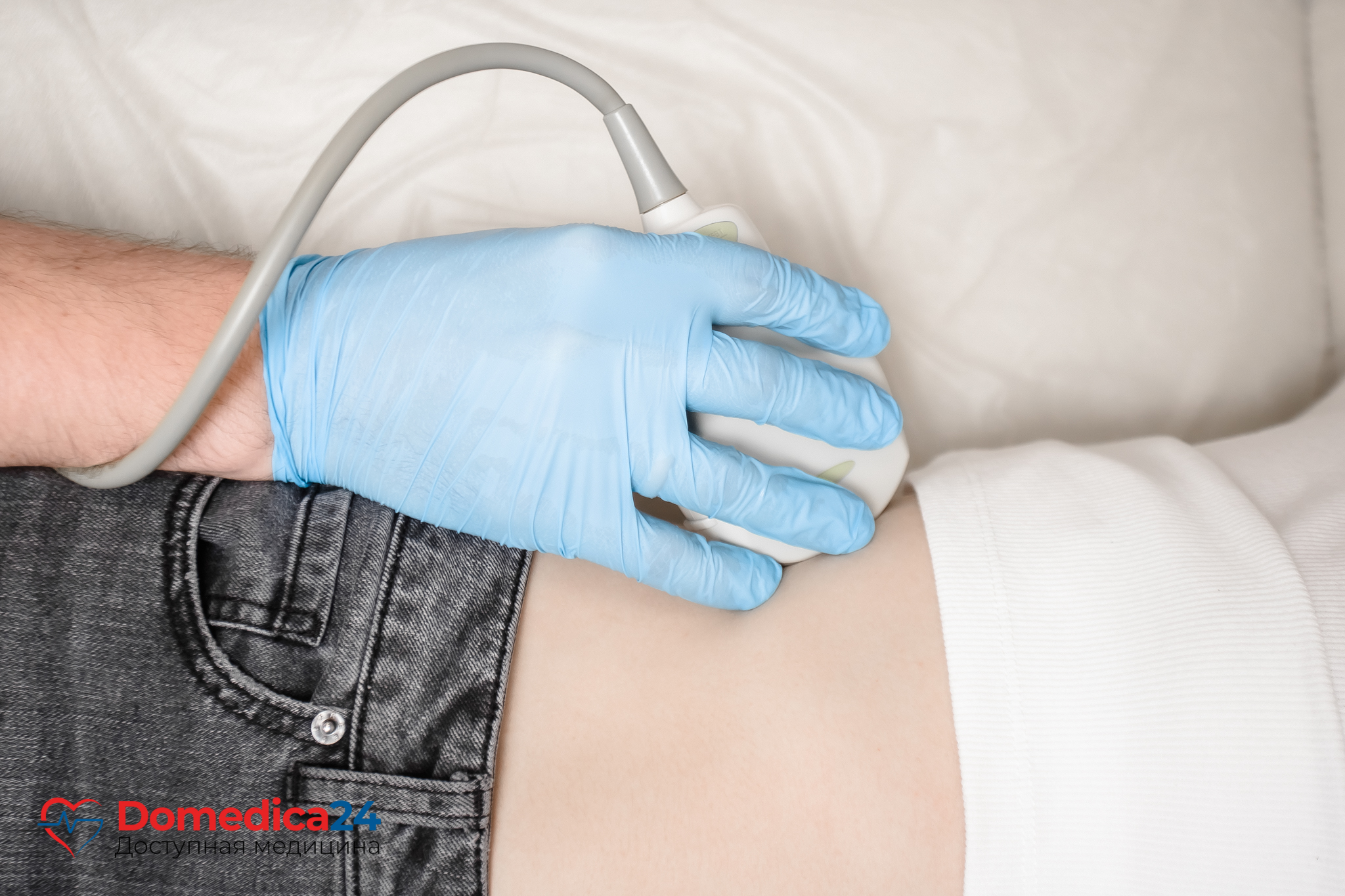 Обследуемый освобождает от одежды правый бок, ложится на кушетку на спину и заводит правую руку за голову. Возможно, потребуется немного повернуться или встать. Врач прикладывает датчик к коже и двигает им по животу и между ребер, стараясь яснее увидеть печень на экране.
