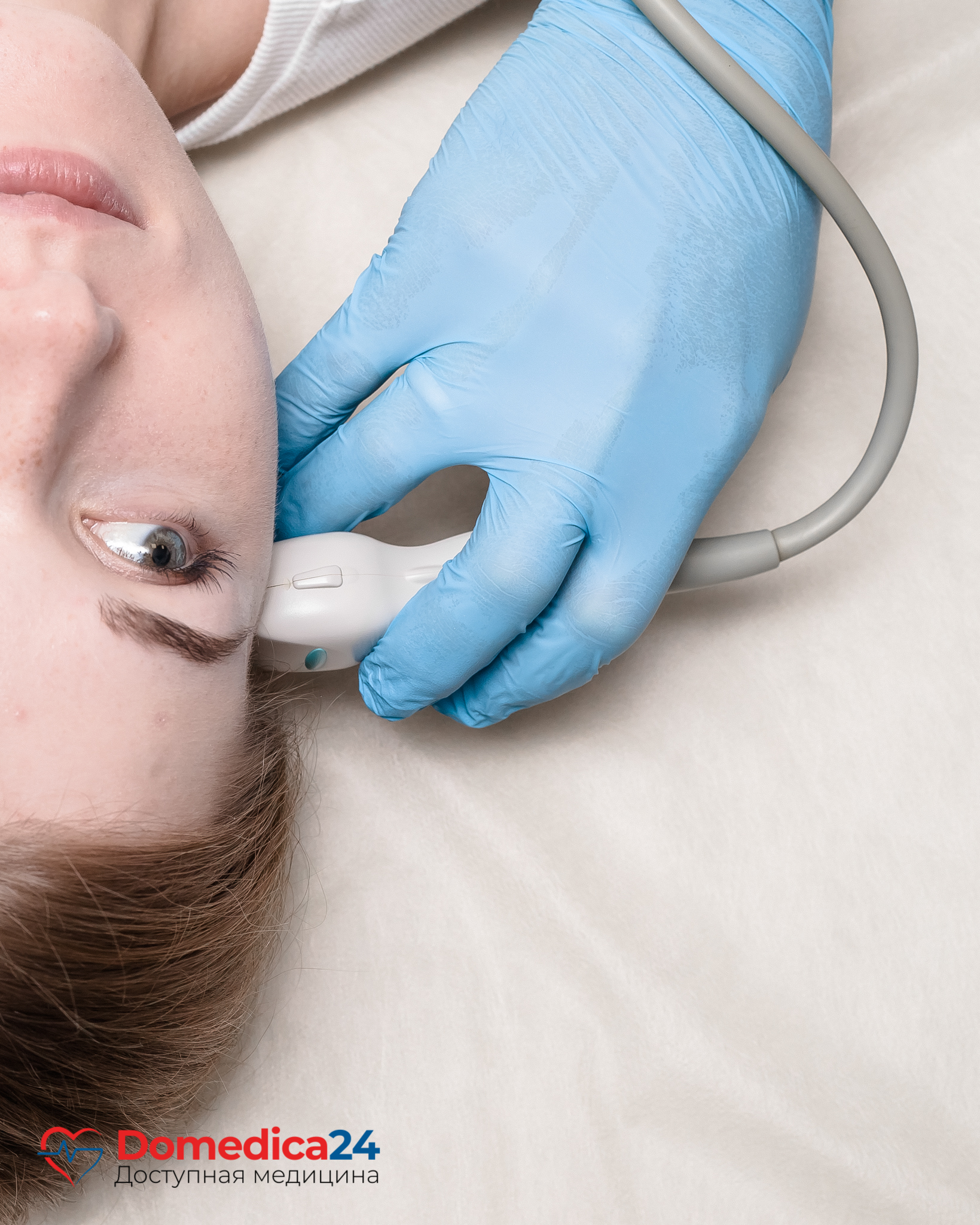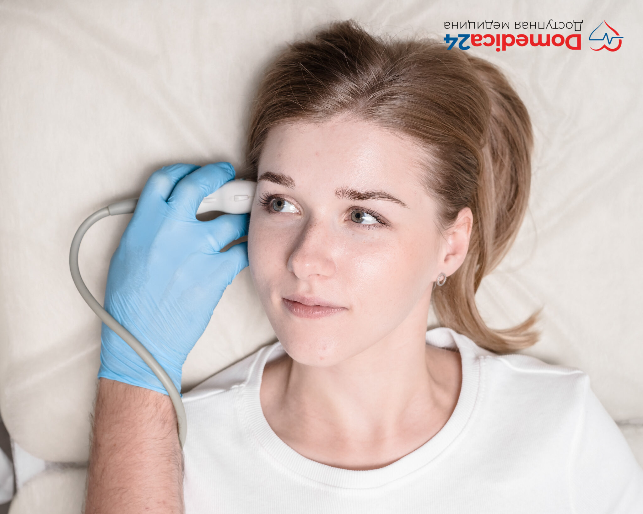 Для процедуры пациент ложится на спину, а голову по указаниям врача поворачивает сначала в одну сторону, потом в другую. Врач наносит на датчик специальный гель и исследует вены и артерии через самые тонкие места в костях черепа ― височные области.
